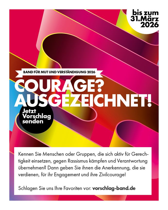Schlagen Sie uns bis zum 31.03.2026 Ihre Kandidatinnen und Kandidaten vor – direkt auf der Webseite www.vorschlag-band.de oder per E-Mail an vorschlag@band-mut-verstaendigung.de. Eine kurze Begründung genügt. Wir freuen uns auf Ihre Vorschläge!