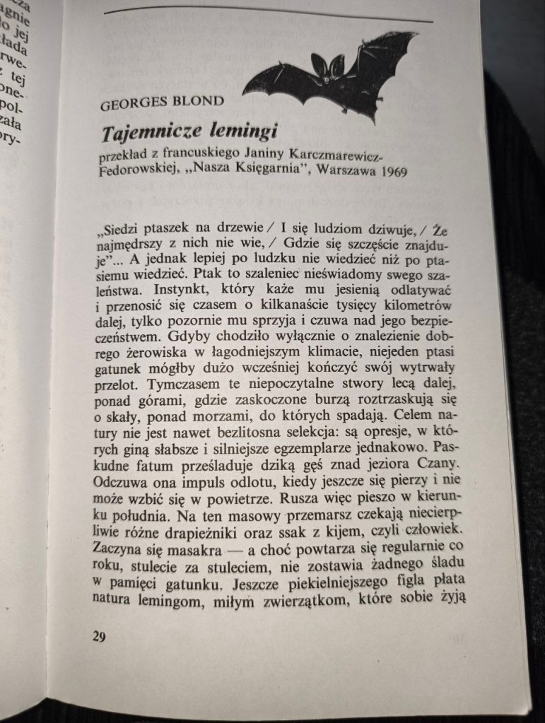 Zaczyna się masakra — a choć powtarza się regularnie co roku, stulecie za stuleciem, nie zostawia żadnego śladu w pamięci gatunku. Jeszcze piekielniejszego figla płata natura lemingom, miłym zwierzątkom, które sobie żyją w norkach. Pewnego dnia robi się ich w tych norkach za dużo, więc gromadnie opuszczają stare siedziby. Aby założyć nowe kolonie opodal? Gdzież tam, żeby iść, po prostu iść, bo tak im każe ich hormonalny los. Iść, dopóki nie dojdą do morza, w którym toną. Gatunek ten trwa tylko dzięki nielicznym osobnikom, co w starych norkach zostały. Historia ludzka ma podobne epizody. Tyle tylko, że my nie musimy czuć się z tym wszystkim szczęśliwi, a podejrzewam, że nad zwierzętami ciąży ponadto przymus szczęśliwości. Blond napisał książkę dla młodzieży.