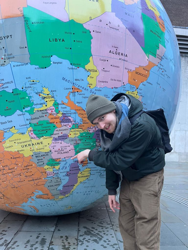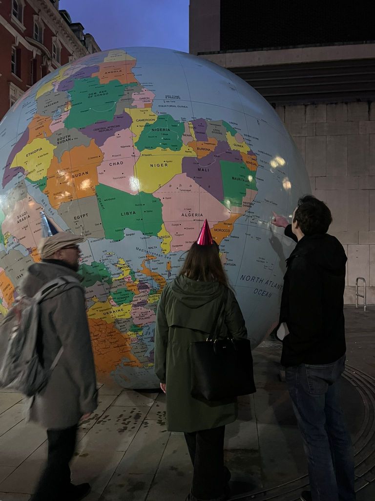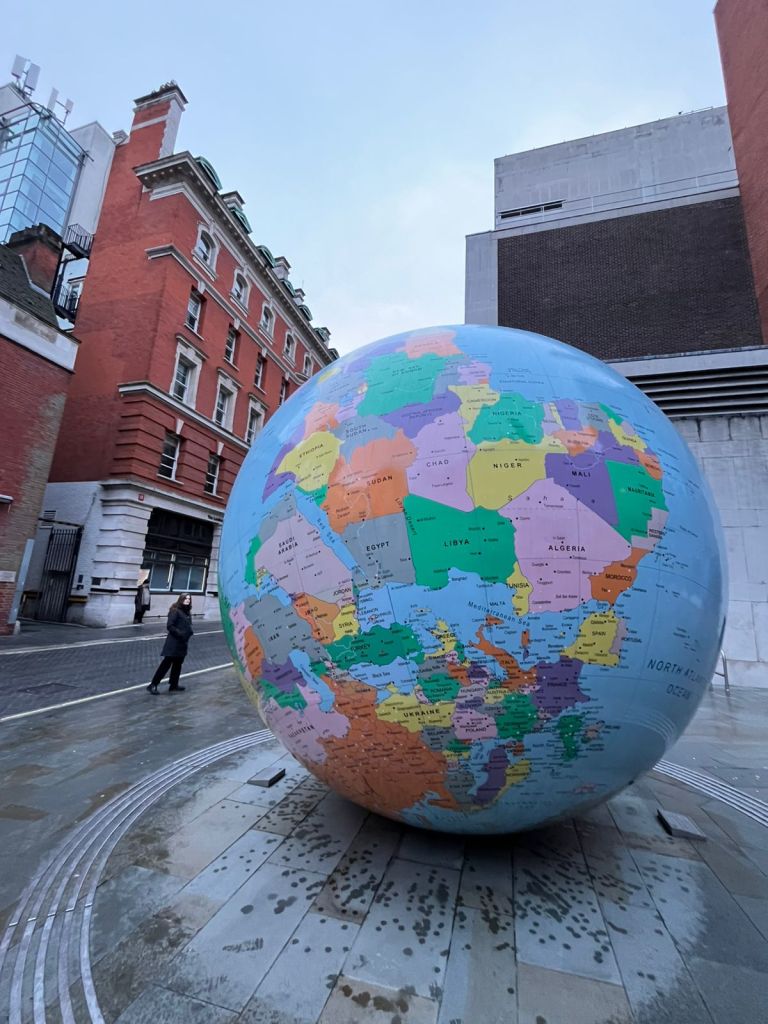 – Now off to another unusual piece of art. Worldwide theme tucked besides the campus of LSE (Holborn). (The World Turned Upside Down). Portugal St.