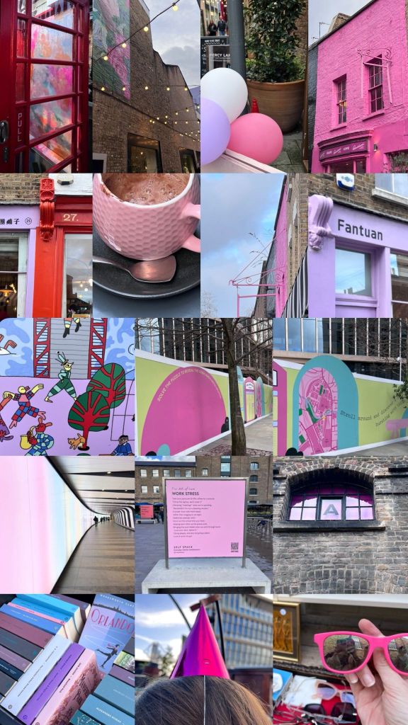 Meet: St Pancras Station 12.55. Pop on your party hats and let the hunt begin. Don’t forget to read the extras on the checklist – don’t want to miss before it’s too late. P.S no obligation to purchase things, but if you don’t, take a photo as proof you went there). Also, blank birthday card for strangers to fill. And before the team part ways, spin the colour wheel (on my phone) – whatever colour you land on, take photos of anything that colour along the way).