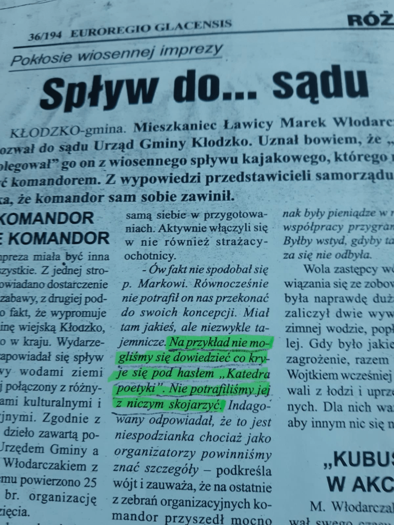 W związku z tym sprawozdanie z realizacji projektu musi się zgadzać z wnioskiem o dofinansowanie, a rzeczywistość – no cóż- nie istnieje. Gdybym próbował dyskutować z wójtem o rzeczywistości, wpadlibyśmy w niekończące się debaty w związku z przyzwoleniem na relatywizm, który się rozpanoszył za sprawą Teorii Względności Einsteina. Ale od czego mamy Katedrę Poetyki. We wniosku o dofinansowanie mamy punkt otwarcie Katedry Poetyki. W reportażu Spływ do sądu można przeczytać “na przykład nie mogliśmy się dowiedzieć co kryje się pod hasłem ‘Katedra Poetyki’. Nie mogliśmy tego z niczym skojarzyć”. Poza sprawozdaniem z realizacji projektu. Bo sprawozdanie musi być zgodne z wnioskiem.