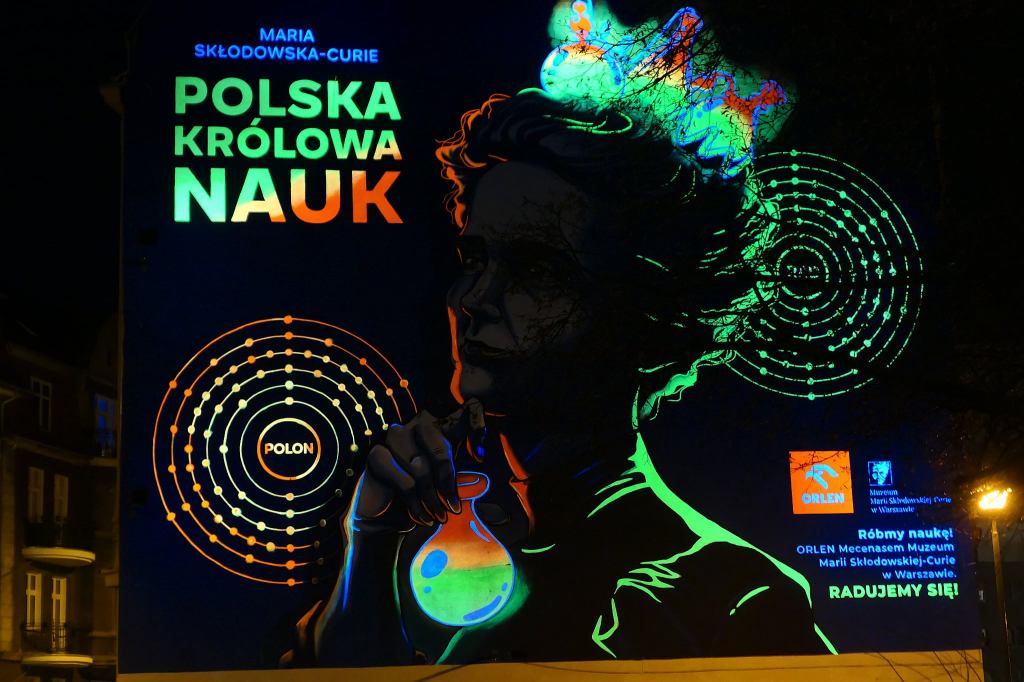 Mural poświęcony jest królowej polskiej nauki, podwójnej noblistce, Marii Skłodowskiej-Curie i zdobi lub nie zdobi (bo zdania są podzielone) ściany kilku budynków w kilku miastach Polski, nie tylko w Poznaniu.