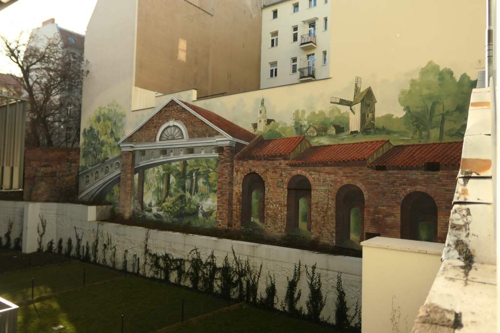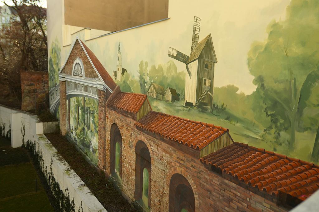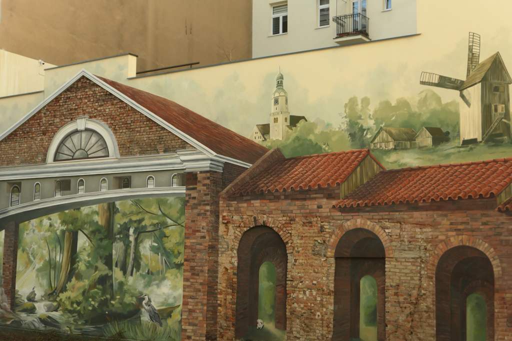 Na muralu znalazł się i kościół wildecki pod wezwaniem Maryi Królowej, zaprojektowany niegdyś przez berlińskiego architekta Oskara Hoßfelda, i stary wiatrak z czasów jeszcze wcześniejszych, otoczony chałupami, których próżno dziś szukać na mapie. Są elementy, jakby wrócone architekturze dzielnicy, których już nie ma, których cegły po rozbiórce wywieziono w nieznanych kierunkach. Są pies i kot, i fauna, i flora podpoznańska. Tuż pod malowidłem rośnie prawdziwy bluszcz, który powoli pnie się w górę. Jeśli nic go nie zatrzyma, za kilka lat dotknie namalowanego muru i połączy rzeczywistość z obrazem.