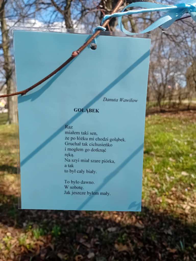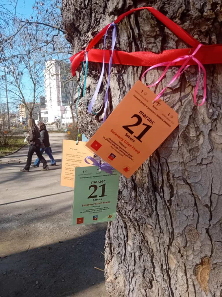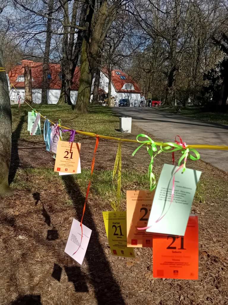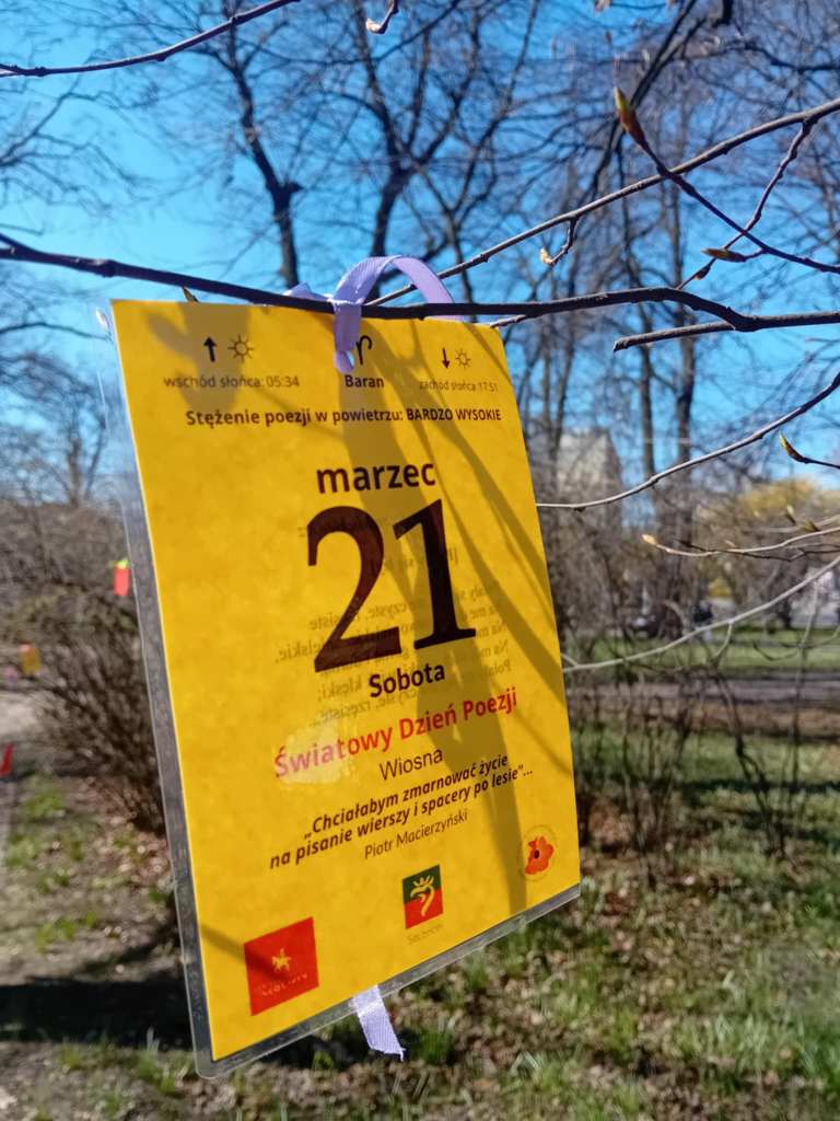 Od kilku lat, może nawet od pięciu, Skolwiński Dom Kultury (Dom Kultury “Klub Skolwin”) wraz z uczniami 9 Liceum Ogólnokształcącego dbają o to, by spacerującym po Parku Żeromskiego w Szczecinie przybliżyć poezję na wyciągnięcie ręki. Wszystko dzieje się 21 marca, w pierwszy dzień wiosny, w dzień wagarowicza i Światowy Dzień Poezji.