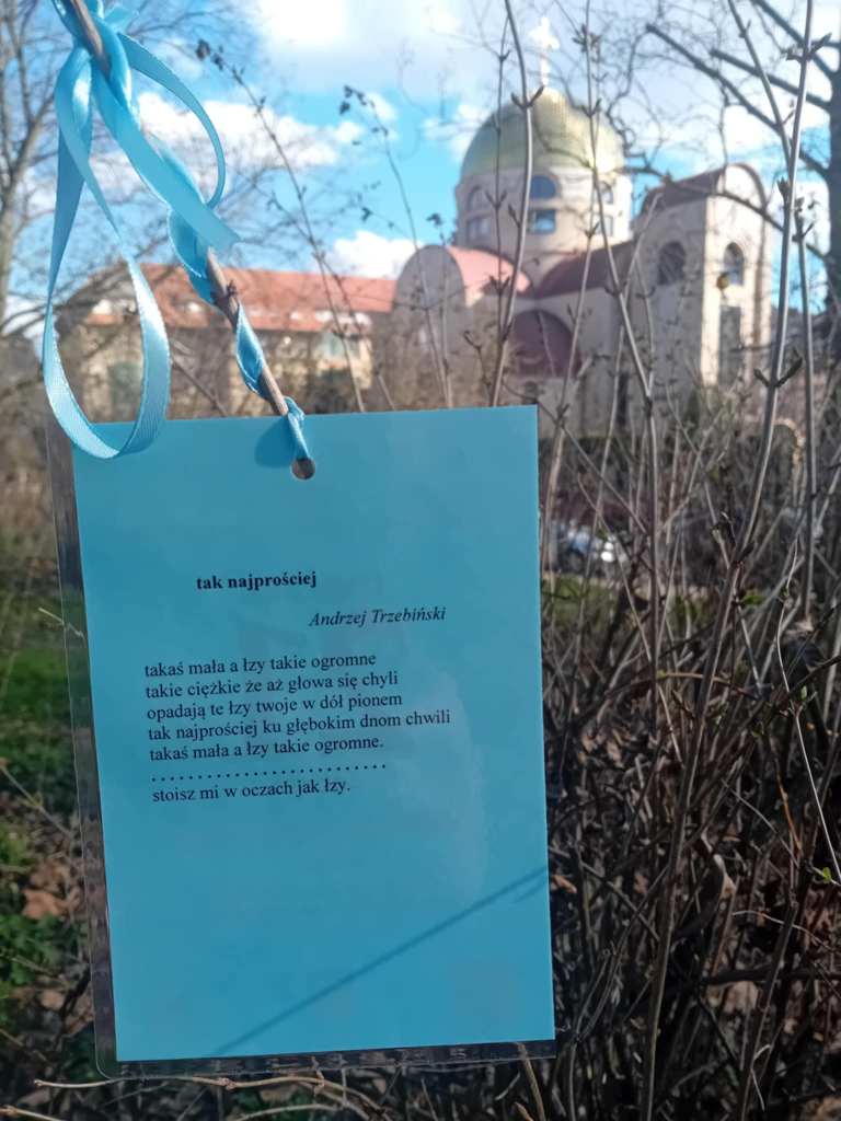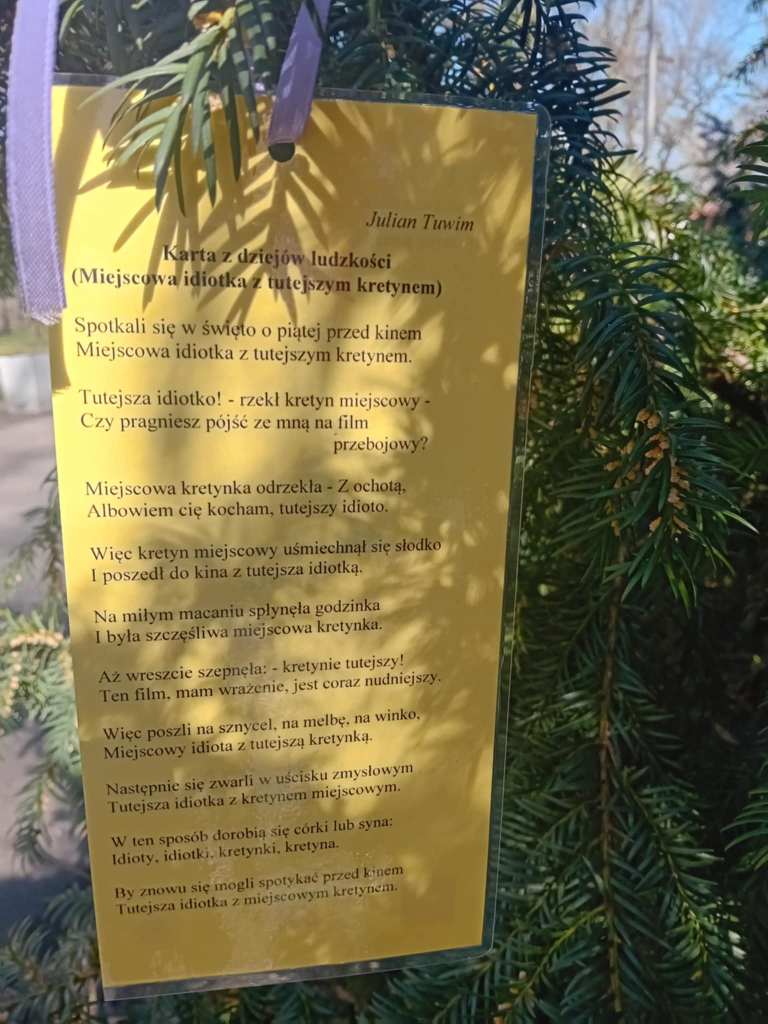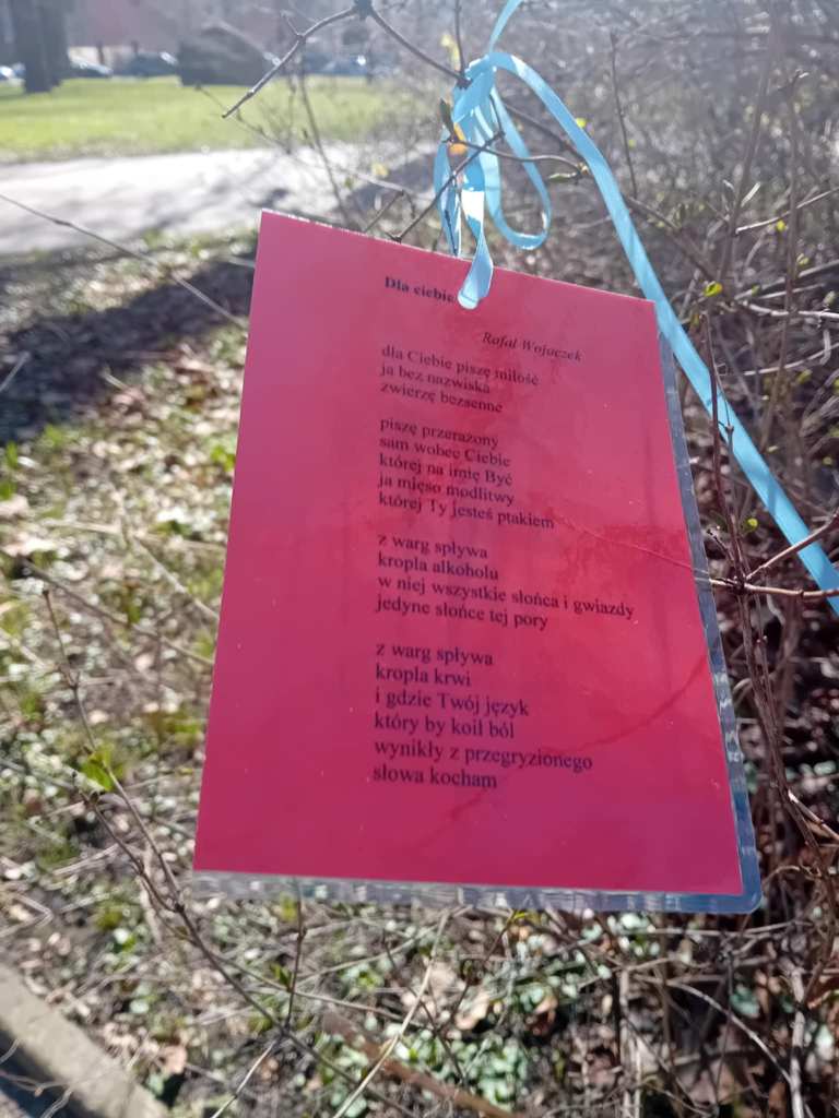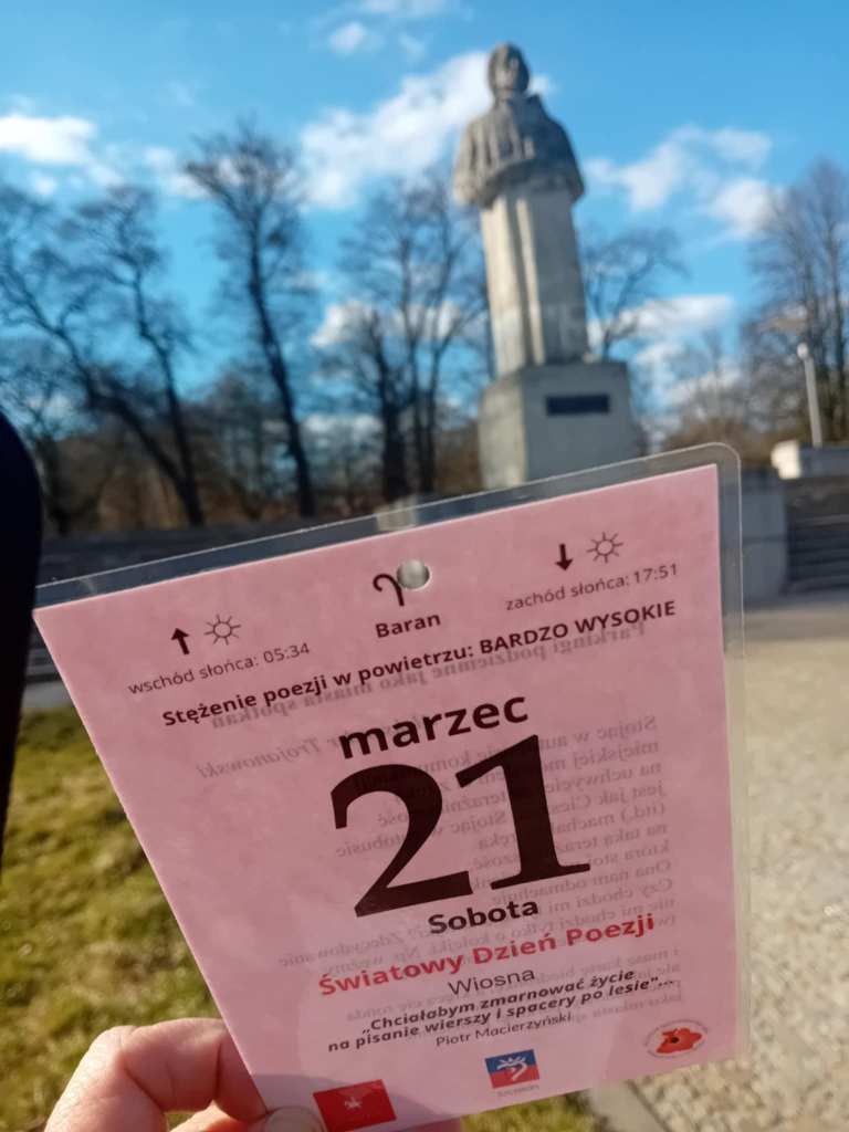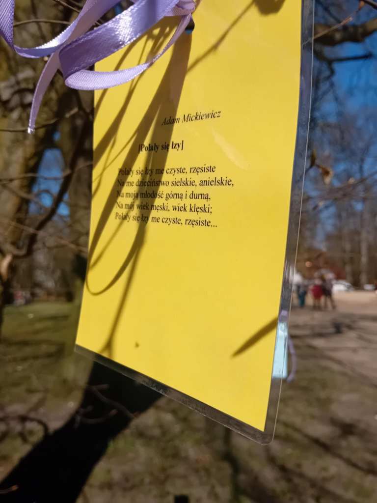 Od kilku lat, może nawet od pięciu, Skolwiński Dom Kultury (Dom Kultury “Klub Skolwin”) wraz z uczniami 9 Liceum Ogólnokształcącego dbają o to, by spacerującym po Parku Żeromskiego w Szczecinie przybliżyć poezję na wyciągnięcie ręki. Wszystko dzieje się 21 marca, w pierwszy dzień wiosny, w dzień wagarowicza i Światowy Dzień Poezji.