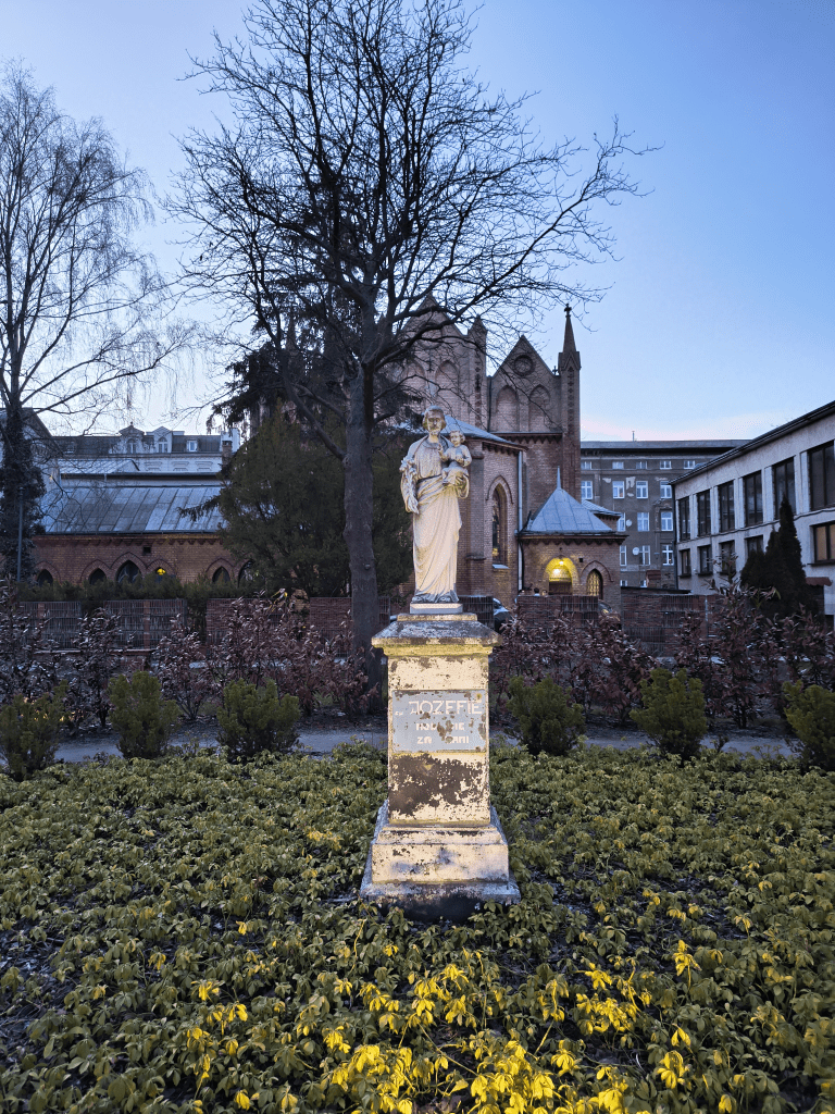 Figura św. Józefa wśród zieleni, na terenie nieistniejącej obecnie III Kliniki Chirurgii