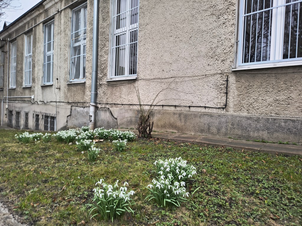 Tegoroczne przebiśniegi na dzikim trawniku przed (niedawno zamkniętym, więc teoretycznie byłym) budynkiem ortodoncji.