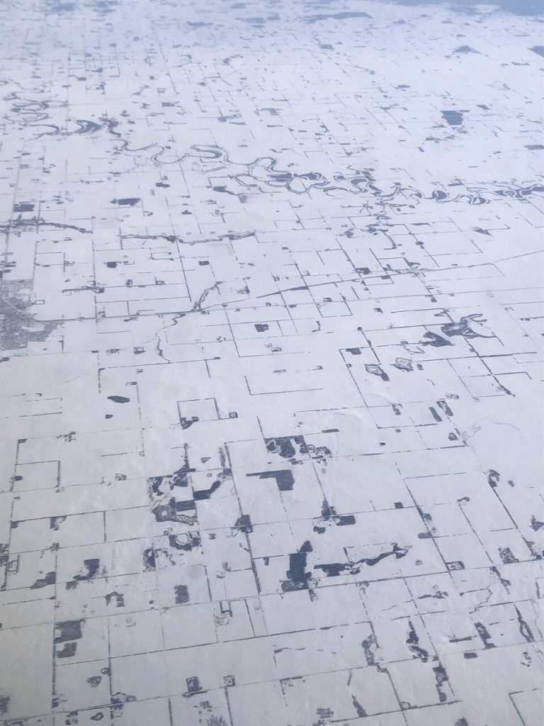 Życie stało się jednoznaczne właściwie dopiero nad północną Albertą. Najpierw w postaci pojedynczych dróg i działek, później ich coraz bardziej skomplikowanych konstelacji, a na koniec zostały tylko cienkie przerwy pomiędzy polami.