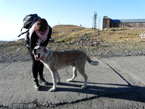 komitas1Podejście na Aragat nie jest trudne. Być może to jeden z najłatwiejszych czterotysięczników na świecie, ale dla pary niewprawionych turystów i tak stanowił wyzwanie. Taksówka dowiozła nas do stacji meteorologicznej i sztucznego jeziora na wysokości 3200 m n.p.m. Tu serdecznie powitał nas miejscowy pies wielkości kucyka, który upodobał nas sobie do tego stopnia, że podążał za nami przez następne kilka kilometrów. Idziemy pieszo ścieżką, a częściej na azymut w kierunku szczytu.