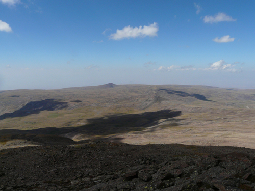 komitas3Minęliśmy wreszcie błyszczącą skałę, przeszliśmy przez okropne rumowisko i trafiliśmy w końcu na wyraźną ścieżkę. Idzie się nam jednak ciężko, trapi nas tajemnicze zmęczenie, a do tego zrobiło się stromo. Nie ufamy też ocenie odległości, wydaje się nam, że do wierzchołka już blisko, ale to może być kolejna iluzja. Postanawiamy, że jeśli nie dojdziemy w pół godziny, zawracamy. Tym razem jednak pomyliliśmy się w druga stronę, po 10 minutach jesteśmy na przełęczy czy raczej brzegu krateru. Widok jest niesamowity – o ile dotąd w krajobrazie dominowały szarości i ciemna zieleń, krater wypełniają złote piaski, które lśnią w promieniach słońca. Jeszcze pięć minut i stajemy na szczycie. Teraz widać, że choć pozostałe wierzchołki są wyższe jedynie o kilkadziesiąt metrów, są dużo trudniejsze do zdobycia, poza naszymi możliwościami, strome i pełne luźnych skał.
