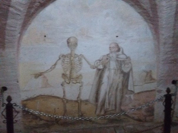 Kameduli, surowi za życia, pozostają takimi po śmierci. Gdy zakonnik umiera, bracia kładą jego ciało na prostą deskę, wsuwają do wnęki w podziemiach kościoła, zamurowują otwór i… tyle. Czeka tam sobie duchowy hazardzista na Sąd Ostateczny. Takie katakumby widział już kiedyś Viator w krakowskim eremie, dziś ogląda je w Wigrach. O przeznaczeniu krypty świadczy jedyny zachowany na jej ścianach fresk: