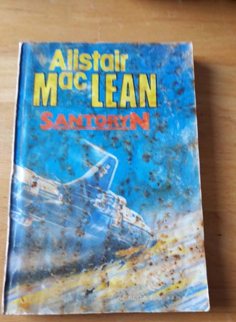 Książka potwornie brzydko wydana w roku 1990 w Spółce Wydawniczej ORBITA. Do tego jeszcze właściciel potraktował ją paskudnie, książka jest poplamiona, nadżarta czymś brunatnym, wytarta, nadpleśniała. W oryginale wydana w roku 1986 – ostatnia powieść autora, którego w latach 70 i 80 wszyscy w Polsce czytali, podobnie jak Raymonda Chandlera, możliwe więc, że wszystkim nam mieszają się powieści obu pisarzy. Nie było, a może i do dzisiaj nie ma polskiego autora (niech mi Joe Alex, Bonda i Krajewski wybaczą), który mógłby się równać z tymi dwoma. Santorynu nie czytałam, ale byłam na wyspie Santorini.