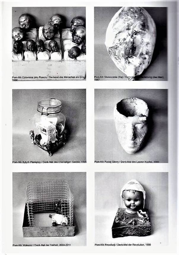 /Obraz: Pom-Niki, wybór ze zbioru 1988-2011. Strona katalogu wystawy„Jacek Wesolowski, Denk-Mal/Pom-Nik”, Zielona Góra-Dresden 2011. Moje Pom-Niki widz powinien sobie wyobrazić jako budowle, stojące w przestrzeni publicznej: na placach, ulicach, w parkach. Na wystawie pokazałem 44 obiekty wys. 20-50 cm plus aneks fotograficzny 44 zdjęć (10 x 15 cm) realnych pomników, fotografowanych przeze mnie w Polsce, w Niemczech i we Włoszech 2010-11./