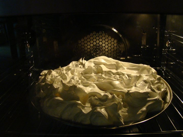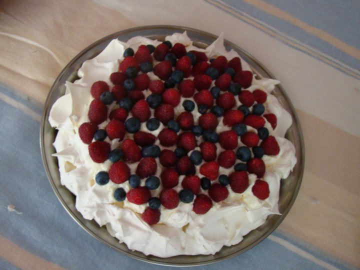 Przyp. adminki: Ten wspaniały tort bezowy to pavlova, o której w tym tekście będzie jeszcze mowa wielokrotnie. Deser wymyślony w Australii lub Nowej Zelandii prawie sto lat temu na cześć genialnej rosyjskiej baleriny – Anny Pavlovej. W naszej rodzinie specjalistką produkowania wspaniałych pavlovych jest moja siostra, Katarzyna Krenz, pisarka i poetka. Tu dwie z jej produkcji, jedna z owocami już na stole, a jedna jeszcze w piekarniku. Nota bene w niemieckiej wersji (zob link poniżej) to wcale nie jest pavlova tylko tiramisu.