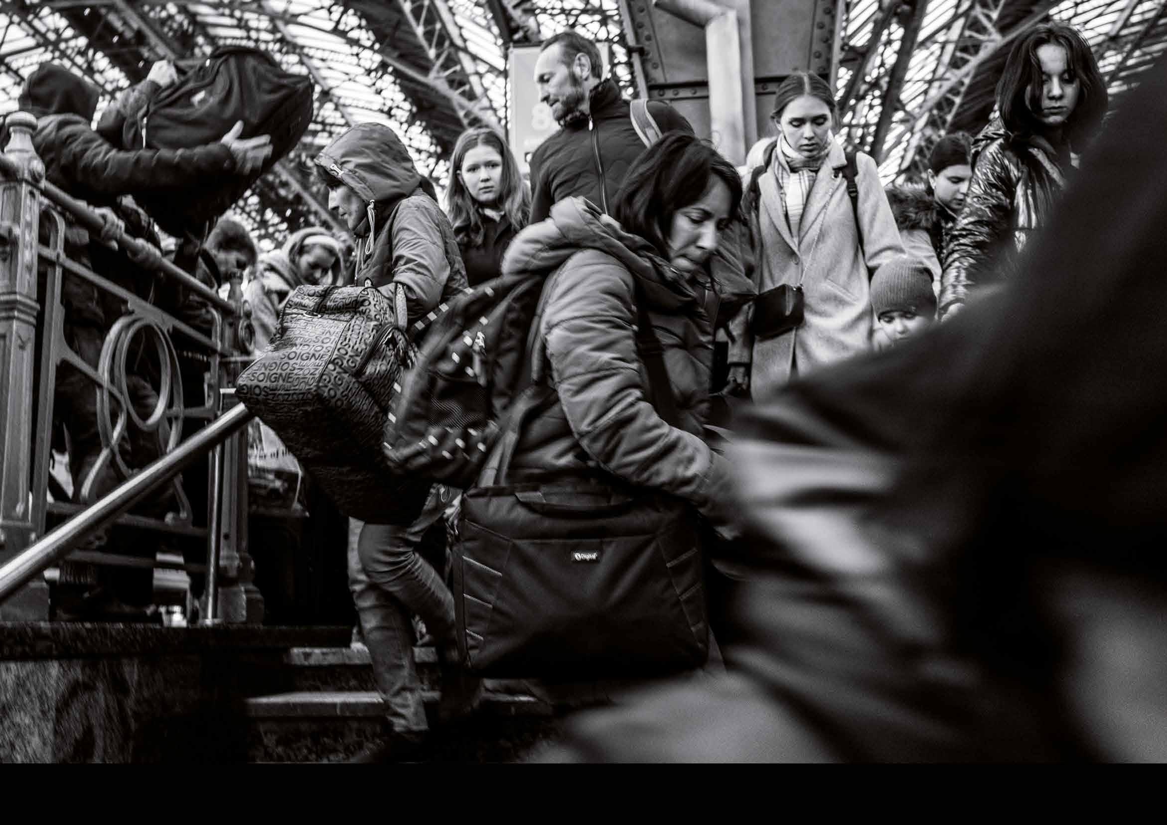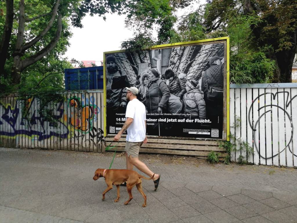 Hier setzt eine Plakataktion des Berliner Dokumentarfotografen Karsten Hein an, die ab Anfang Juli bis in den September hinein in Berlin und Brandenburg auf Plakatflächen der Firma Ströer zu sehen sein wird. Hein möchte das Bewusstsein für die menschlichen Schicksale der aus der Ukraine Fliehenden und bereits Geflüchteten wachhalten. Dabei setzt er auf Bilder von hohem Wiedererkennungswert, die dem Bereich der Straßenfotografie zugeordnet werden können. Keine Schreckensszenen aus dem Krieg, keine verzweifelten Gesichter, sondern Menschen aus dem Osten der Ukraine, die – oftmals erschöpft – eine Bahnhofstreppe in der westukrainischen Stadt Lviv heruntergehen, bepackt mit dem Nötigsten, auf dem Weg zu uns unbekannten Zufluchtszielen. Zu sehen ist immer wieder der mehr oder weniger gleiche Bildausschnitt, aber mit jeweils anderen Menschen, die symbolisch stehen für den anhaltenden Exodus aus dem schwer vom Krieg gebeutelten Land. Sieben Motive sind für die Plakataktion ausgewählt worden und werden nacheinander an immer wieder neuen Standorten zu sehen sein, versehen mit einem Spendenaufruf der Caritas, die – wie andere Hilfsorganisationen in Deutschland auch – Ukrainekriegsflüchtlingen Unterstützung bietet und mit der Hein bereits seit 2003 immer wieder projektbezogen zusammenarbeitet.