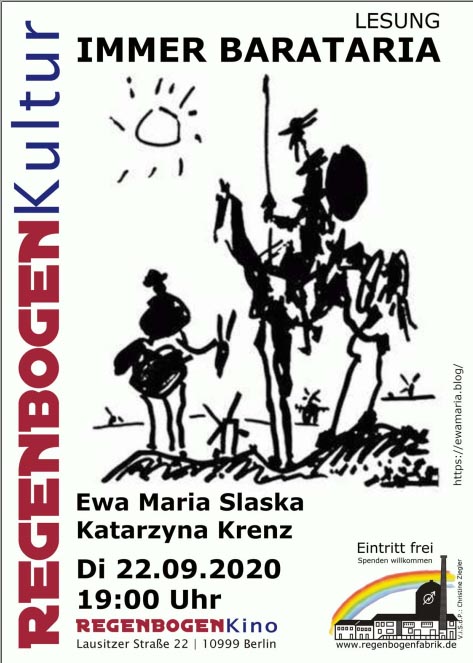 Seit Januar 2017 publizierte Ewa Maria Slaska dreiundhalb Jahre lang auf ihrem Blog Texte (meistens eigene, manchmal aber auch von ihren Friends) über alten Rebell (und Ritter) Don Kichot, und seinem Friend (und Knappe) Sancho Pansa. Die beiden sind unzertrennlich, schon im Roman von Cervantes, seit dem aber auch in unserem Kulturerbe. Es sind nur zehn Tage, dass der Herr und sein Knappe ihren Abenteuer getrennt den Stirn bieten – das ist die Zeit Sancho Pansas als Gubernator auf einer vermeintlichen Insel Barataria.