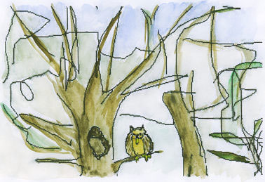 Spät am Abend fanden die Wanderer eine große Baumhöhle. Dort gab es einen kleinen Teich aus dem man trinken und in dem man sogar baden konnte. Aranka entfachte das Feuer und Orsolya fand eine Harzader, die sich als schmackhaft und süß wie Honig erwies. Auf diese Art bekamen sie ein ausgezeichnetes Abendessen. Und wie am Vorabend kuschelten sich die Zwillinge an den Schäferhund Lusto. Auch die Feldmaus Okosch fand im Riesenfell des Hundes ihren Platz. Nur der Rabe Hollo hielt schläfrig Wache am Rande der Höhle.