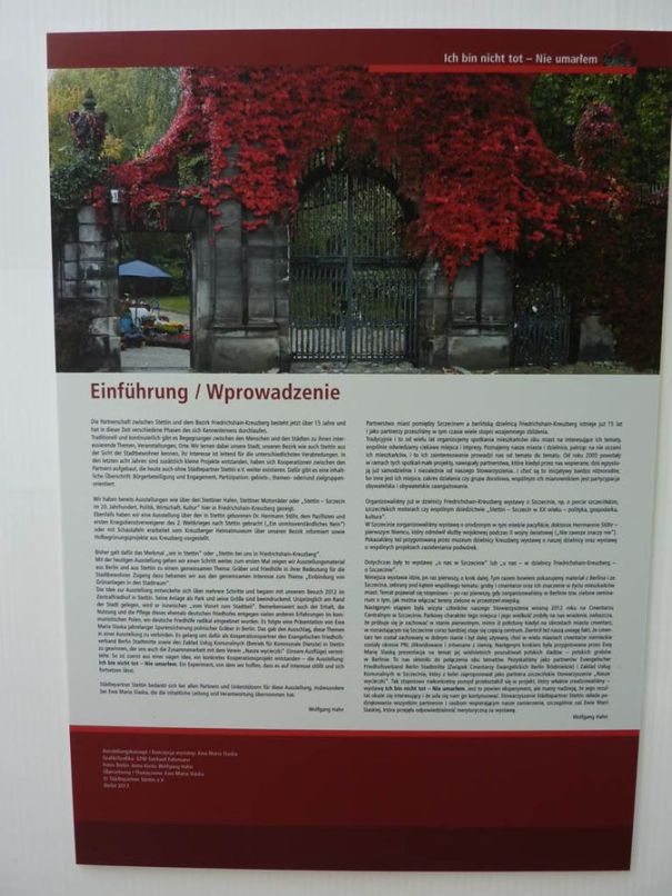Ja też. Pisałam już o tym. To dzięki niemu, Anne i Wolfgangowi Hahnowi zorganizowaliśmy w roku 2015 tu, na tym cmentarzu wystawę o polskich grobach w Berlinie i niemieckich w Szczecinie, a potem wydaliśmy książkę, zatytułowaną Ich bin nicht tot / Nie umarłem. Pozwoliłam sobie przynieść tu kilka egzemplarzy tej książki. To publikacja po polsku i po niemiecku. Może kogoś zainteresuje. Jeśli tak, to proszę sobie wziąć egzemplarz.