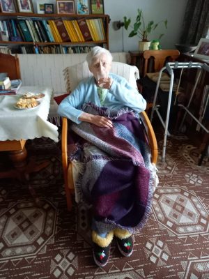 Zofia Slaska była mamą mojej najlepszej przyjaciółki na studiach, Ewy Marii Slaskiej. Gdy wyszłam za mąż za brata Ewy, Marka, ja też nazywałam się Ewa Maria Slaska, a mama Ewy i Marka została moją teściową. Gdy rozwiedliśmy się z Markiem, nadal mówiłam do niej “mamo” i często odwiedzałam ją i Ewę. Ewa umarła w roku 2005, teściowa dwa tygodnie temu. Zdjęcie zrobione tydzień wcześniej.