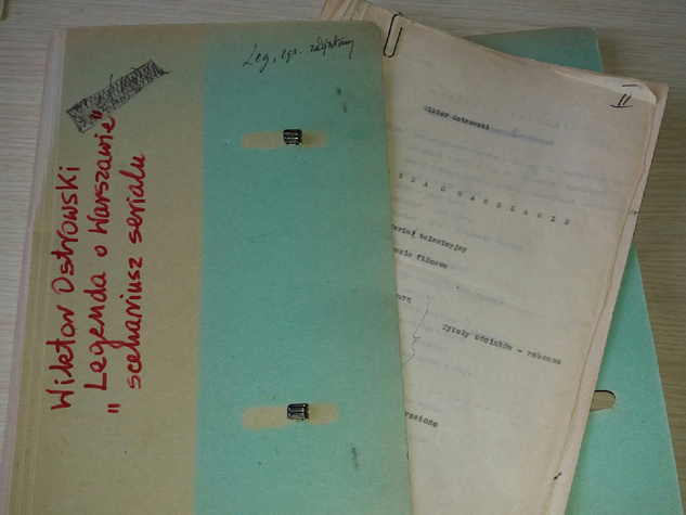 Przeglądając karton ze zdjęciami, notatkami i starymi oryginałami twórczości mojego Ojca na samym dnie znalazłam wyblakłą teczkę z napisem – “WIKTOR OSTROWSKI, Legenda o Warszawie, scenariusz serialu” – i przypomniałam sobie że w drugiej połowie roku 1955 Wiktor rozpoczął pisanie czegoś co przed nami wszystkimi trzymał w tajemnicy. Wypatrzyliśmy jednak, co pisze i od tej pory dawał nam kawałkami do czytania. Nie był pewny, co to będzie, czy to ma być książka czy scenariusz. W końcu zdecydował się na sześcioodcinkowy scenariusz. Przerabiał go wiele razy, aż na początku lat 60, uznał, że skończył pisanie, dał nam do przeczytania, ale mnie wtedy trudno było ocenić, ile to jest warte.