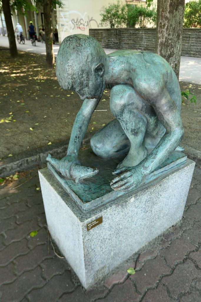 Na wyspie nie ma kóz, w pobliżu chyba też nie. Malownicza ulica rybaków, (Fischerstraße), dawnych właścicieli kóz też pusta. Jedynie chłopca z rybą zaklętego w kamień zobaczyłam, ale już trochę dalej (https://de.wikipedia.org/wiki/Kunst_im_%C3%B6ffentlichen_Raum_in_Frankfurt_%28Oder%29#/media/Datei:2006-05_Frankfurt_(Oder)_02.jpg).