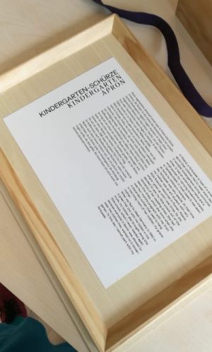 Ze wszystkich elementów wystawy największe wrażenie zrobiła na mnie kolekcja pudełek z fragmentami czyichś ubrań, do których dołączony był opis… Otworzyłam na chybił trafił jedno z pudełek, zatytułowane Kindergartenschürze, czyli fartuszek do przedszkola.
