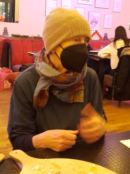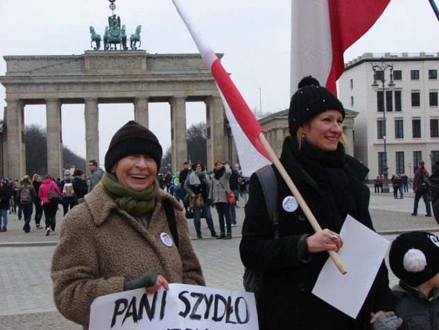 No cóż, zdjęcie ma parę lat. Wtedy protestowaliśmy przed Bramą Brandenburską przeciw Beacie Szydło. Minęło, nawet nie wiem, czy pamiętamy, jaką wstrętną była premierką. Obok mnie moja synowa, a chłopczyk w czapce z białymi uszami misia pandy, to mój wnuk. Nie wiem kto zrobił zdjęcie. Mam na sobie płaszcz mojej Mamy.