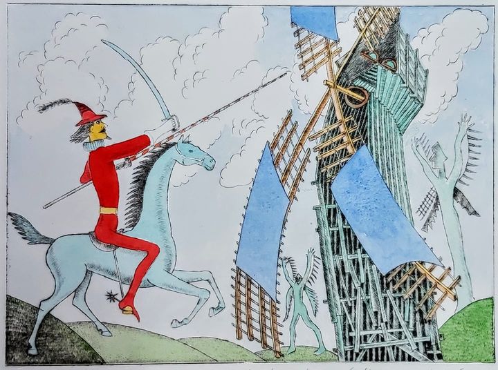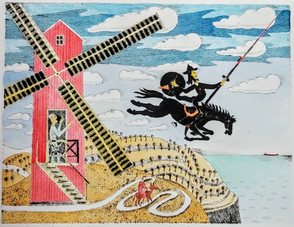 Dawniej Don Kichot był taki – i jakby kto go chciał kupić, np. pod choinkę, to niech znajdzie artystę na Facebooku. Drzeworyt kolorowany akwarelą, 350 złotych.