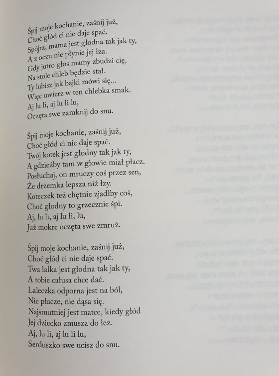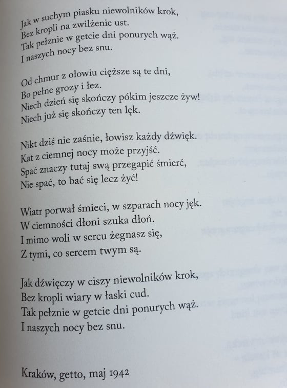 W późniejszej, okupacyjnej twórczości autora te jaśniejsze nutki giną, rodzi się dramat. Jak dla mnie najsmutniejsza, ale jednocześnie najbardziej przepełniona miłością jest kołysanka – Hungerik dajn kecele, Głodny kotek, do której muzykę napisał Juliusz Hoffman. Nie wiadomo, kiedy powstała ta piosenka, autor na ogół nie datował swoich utworów, ale myślę, że już w ostatnim okresie życia Mordechaja Gebirtiga, między jego pobytem w podkrakowskich Łagiewnikach i murach getta w Podgórzu.