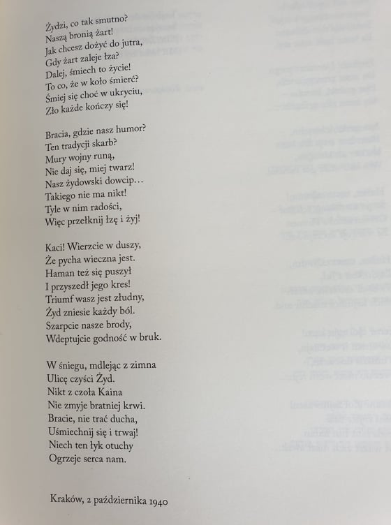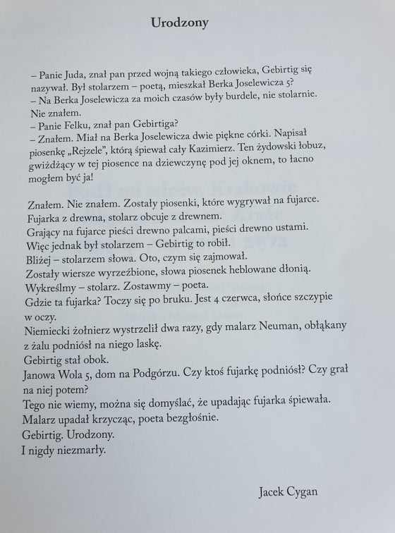 Tłumaczem utworów Mordechaja Gebirtiga na język polski i autorem wyżej zamieszczonego wiersza jest poeta i autor tekstów piosenek, Jacek Cygan. Jest on również jednym z autorów wstępu do książki o żydowskim bardzie z dawnego Krakowa, która od kilku dni leży u mnie stole. Oprawę muzyczną do swoich wierszy Gebirtig układał głównie sam, ale często przyciągały one również uznanych kompozytorów. Na przykład Manfreda Lemma, niemieckiego kompozytora, który napisał muzykę do tytułowego wiersza Blajb gezunt mir Kroke, czyli Bądź mi zdrów Krakowie: