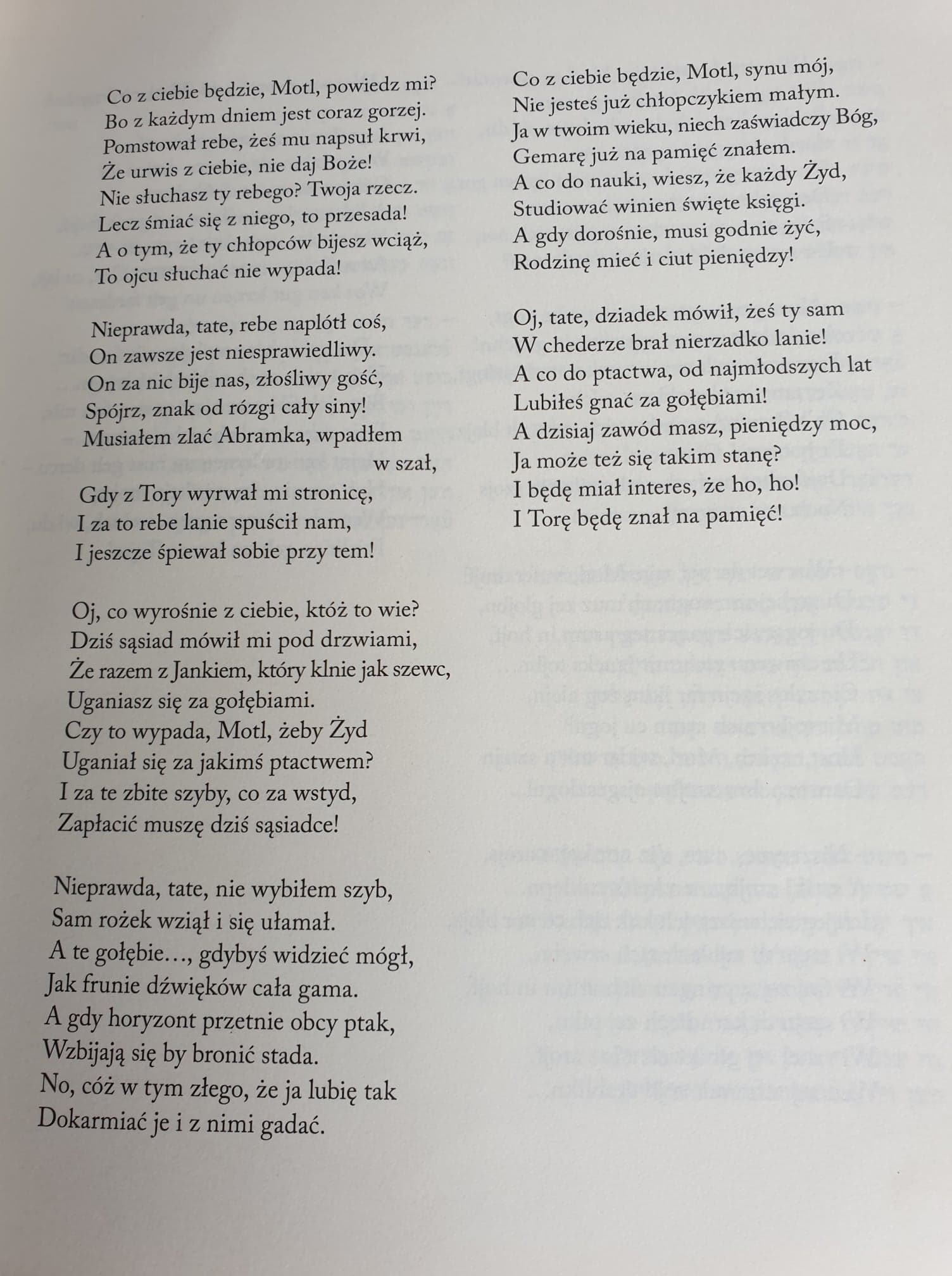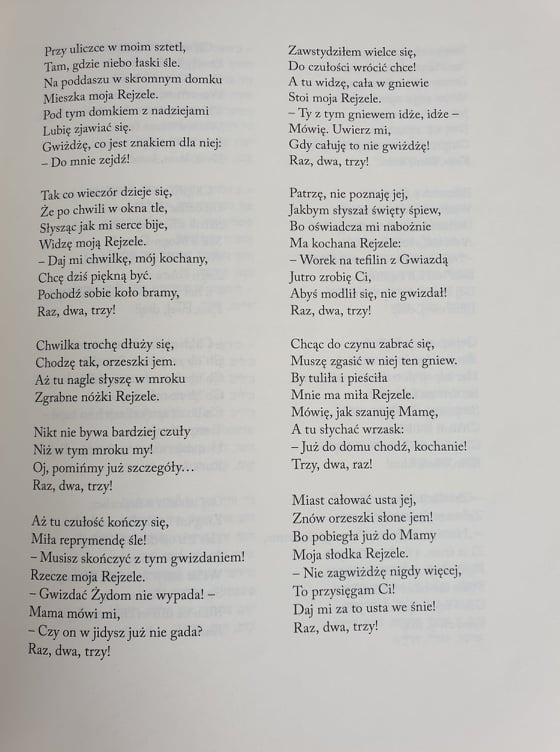 Jednak nie mogę książki o Mordechaju Gebirtigu tak zostawić, jak to zrobiłem dwa wpisy wstecz. Krakowski bard śpiewał z rozpaczy nad ginącym, żydowskim światem, bo kochał swój ubogi sztetl, jego życie i ludzi. Poświęcił im tomik Majne lider, wydany w Wilnie, w 1936 roku, staraniem przyjaciół poety, którego nie było stać na samodzielne opublikowanie swoich wierszy. Miał na utrzymaniu żonę Blumę i trzy córki, i zupełnie nie dbał o sławę, ani o pozyskiwanie mecenasów dla swojej twórczości. Ukochana żona często strofowała go, że za mało zajmuje się domem i poświęca czas na błahostki i ten wątek poeta również wykorzystał w kilku humorystycznych wierszach. Tomik zawierał ponad pięćdziesiąt piosenek wraz z załączonymi nutami, opowiadających o dzieciństwie poety, jego rówieśnikach, chederze, czasach kawalerskich. Są w nim zakochani, klezmerzy, zatroskane matki i rozbrykane dzieci, świetne dialogi i puenty*.