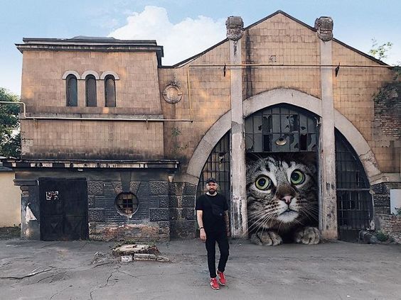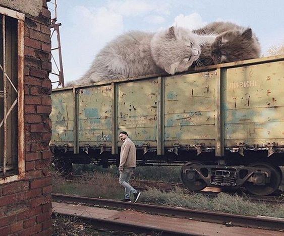 Und es stimmt. Auf den anderen Photos sieht man es ganz genau. Die Wirklichkeitselemente sind real und die Katzen auch, der Künstler verbindet sie und verarbeitet im Photoshop.