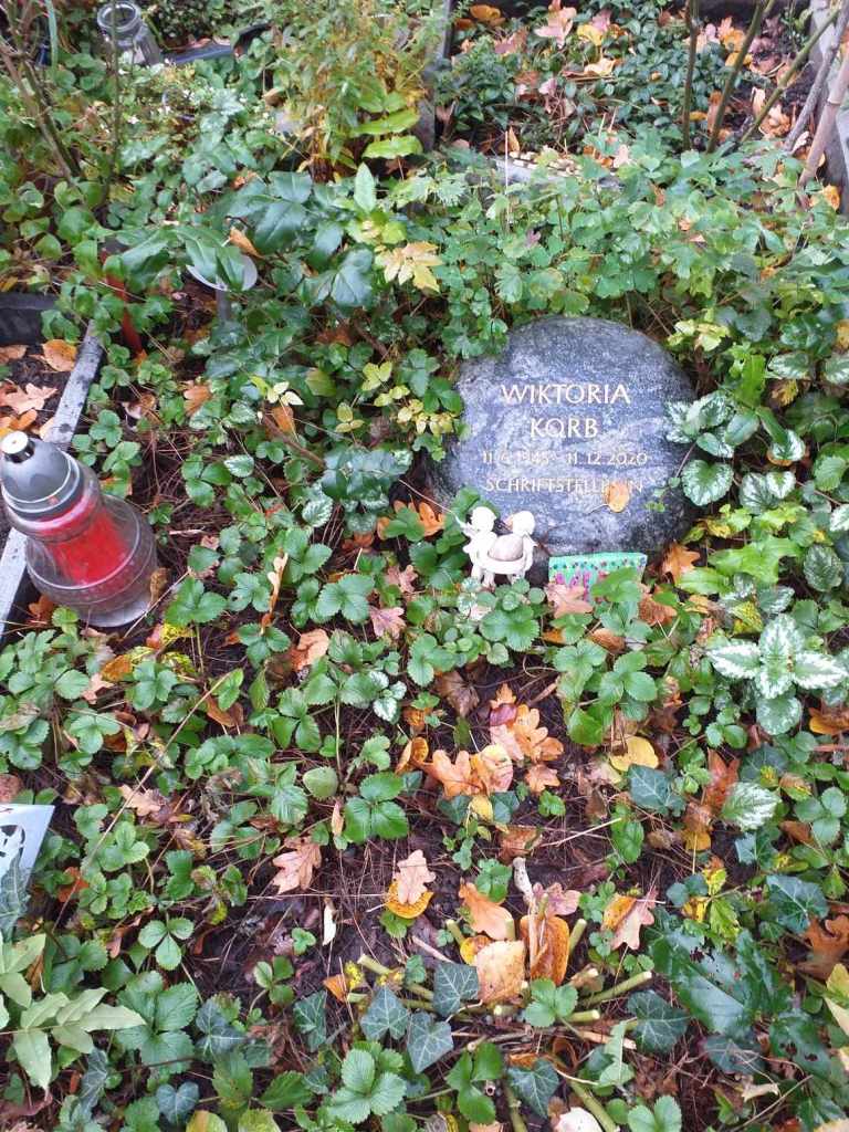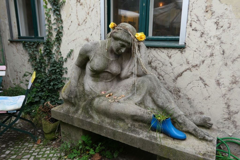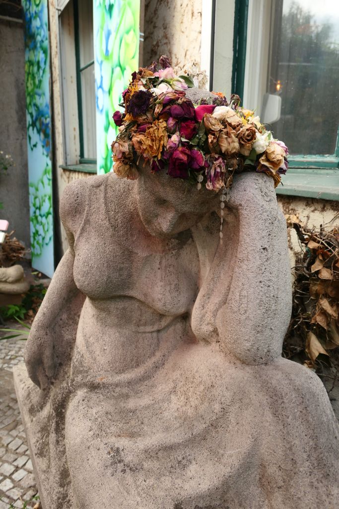 I wreszcie cmentarz artystów na Stubenrauchstrasse. Leży tam Marlena Dietrich a także nasza przyjaciółka Viki, ta, z którą zaprzyjaźniłam się już po jej śmierci. Idąc do Marleny kierowałam się zawsze aniołem. Bo wysoki i miał oko na wszystko. Anioł okazał się kobiecą postacią opłakującą. Zszedł ( w zasadzie zeszła) z piedestału. Oparła się o drzewo, a ponieważ ją do niego przywiązano, stoi, marznie i moknie. Obraz nędzy i rozpaczy….i przemocy wobec kobiet. Z cyklu: cmentarne baby.