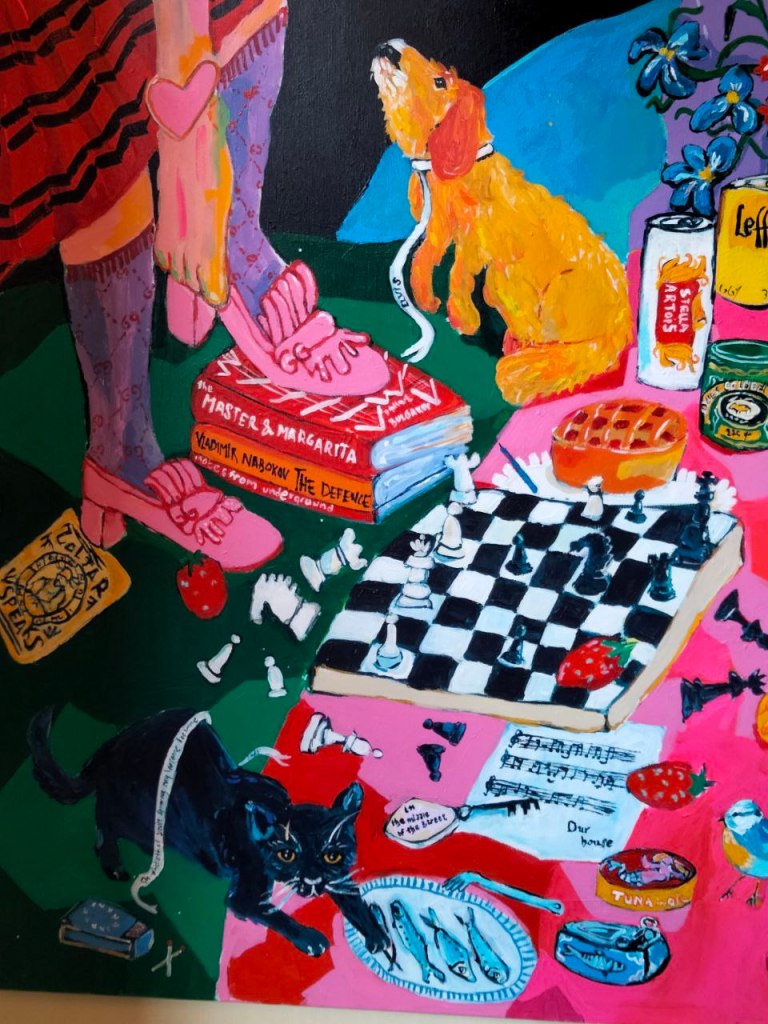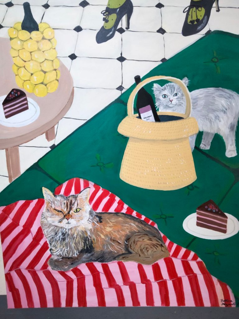 Ciekawe, że na wszystkich obrazach z kotami jest też jedzenie, a na dwóch również kobiece nogi w eleganckich pantofelkach.