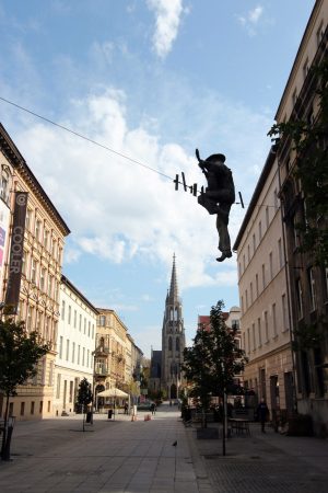 A naprzeciwko, już po drugiej stronie ulicy, zardzewiały jeździec na koniu. Pomyślałam od razu o Don Kichocie. Nie, Tomek powiedział do mnie, spoglądając na jeźdźca bez rąk, patrz Don Kichot! To nie był Don Kichot, choć mógłby nim być, po potyczce z kotem. Bo co to za nazwa Koń 87, tym bardziej, ze najbliższa rzeźba Don Kichota stoi sobie w Jeleniej Górze (proszę zobaczyć – TU). Z rzeźbą Koń 87, jeśli to prawda, co piszą w internecie, wiąże się bardzo smutna historia. Koń, ten prawdziwy, który pozował artyście (Zbigniew Frączkiewicz) nagle przestraszony, uciekł, a uciekając złamał nogę. Nie było w pobliżu zaklinacza koni, ani nikogo, kto by się podjął leczenia rumaka, a że rzeźba była na ukończeniu i koń nie był już potrzebny, nikt się nie zastanawiał. Został uśmiercony. Niefart prześladował konia nawet śmierci, już tego konia z brązu.