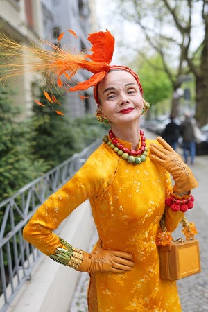 Ein Vogel auf dem Hut! Brrr! Ist er echt? Das Kleid gelb, auch eine Farbe, die en masse und in solcher Schrilligkeit ein Unglück sein kann, aber die Frau ist gemacht, wie selten eine. So viel Mut beim Kleiden haben die sehr junge Cosplayer in Japan, aber eine alte Frau fast nie. Mutig, mutig. Mutig und interessant. Aber tatsächlich coquett. Zu coquett für meine Bedürfnisse.