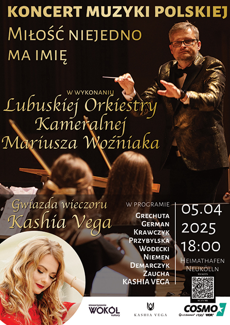 Z radością zapraszamy na Koncert Muzyki Polskiej „Miłość niejedno ma imię”, który odbędzie się 5 kwietnia o godz. 18:00 w przepięknej sali balowej Heimathafen Neukölln w Berlinie. Wydarzenie to będzie wyjątkowym hołdem dla polskiej muzyki, a w wykonaniu Lubuskiej Orkiestry Kameralnej Mariusza Woźniaka (11 wokalistów oraz 18 instrumentalistów) usłyszymy najpiękniejsze polskie piosenki, w tym utwory takich legend, jak Andrzej Zaucha, Marek Grechuta, Anna German czy Ewa Demarczyk. Gość specjalny wieczoru – Kashia Vega – mieszkająca w Berlinie laureatka the Voice of Polonia 2024, zabierze nas w muzyczną podróż, wykonując wraz z orkiestrą wybrane autorskie piosenki z nadchodzącej płyty “Kropla” o kobiecej naturze.