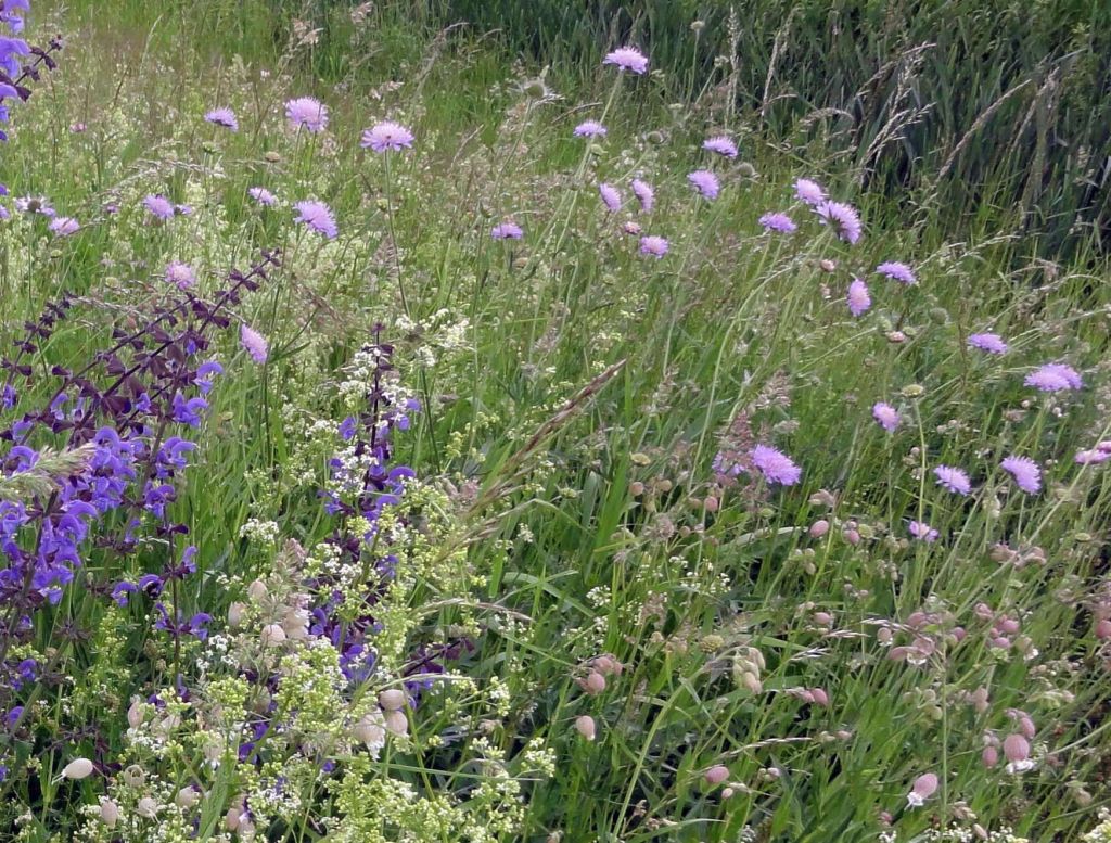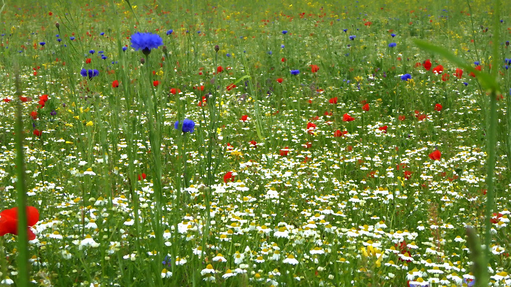 Naturwiesen sehen nicht besonders anziehend aus, sind aber “Natur”, die Farbwiesen sind dagegen meistens eine künstliche Mischung, die oft sogar exotische Pflanzen beinhaltet, ist aber als Farbtupfen viel “schöner” und sieht so aus: