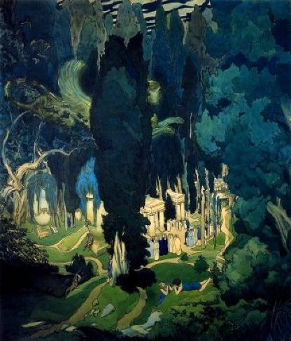 Leon Bakst (1866-1924), Elizjum. zielone łąki w cieniu ciemnych drzew.