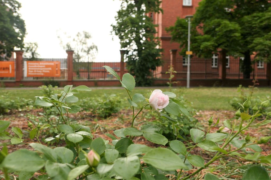 Na placu kwitną białe róże o bladoróżowym odcieniu. Nie ma żadnej informacji o więzieniu.