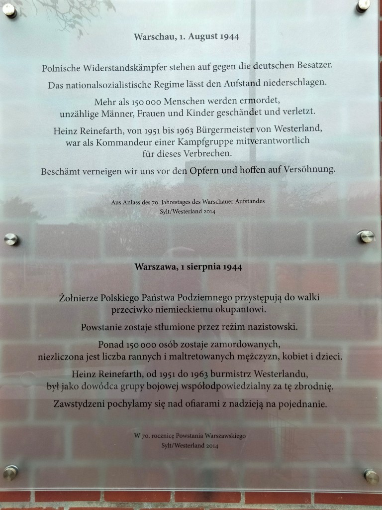Tablica umieszczona jest na ścianie ratusza miasta Westerland, stolicy Syltu. Erygowano ją dziewięć lat temu, starannie budując zdania tak, by nie było wątpliwości, o co chodzi, ale zarazem tak, by żadne z nich nie wydrapało czytającym oczu i nie wyrwało serca. Pamięć w Westerlandzie zaistniała, ale nie boli i nie zadaje ran.