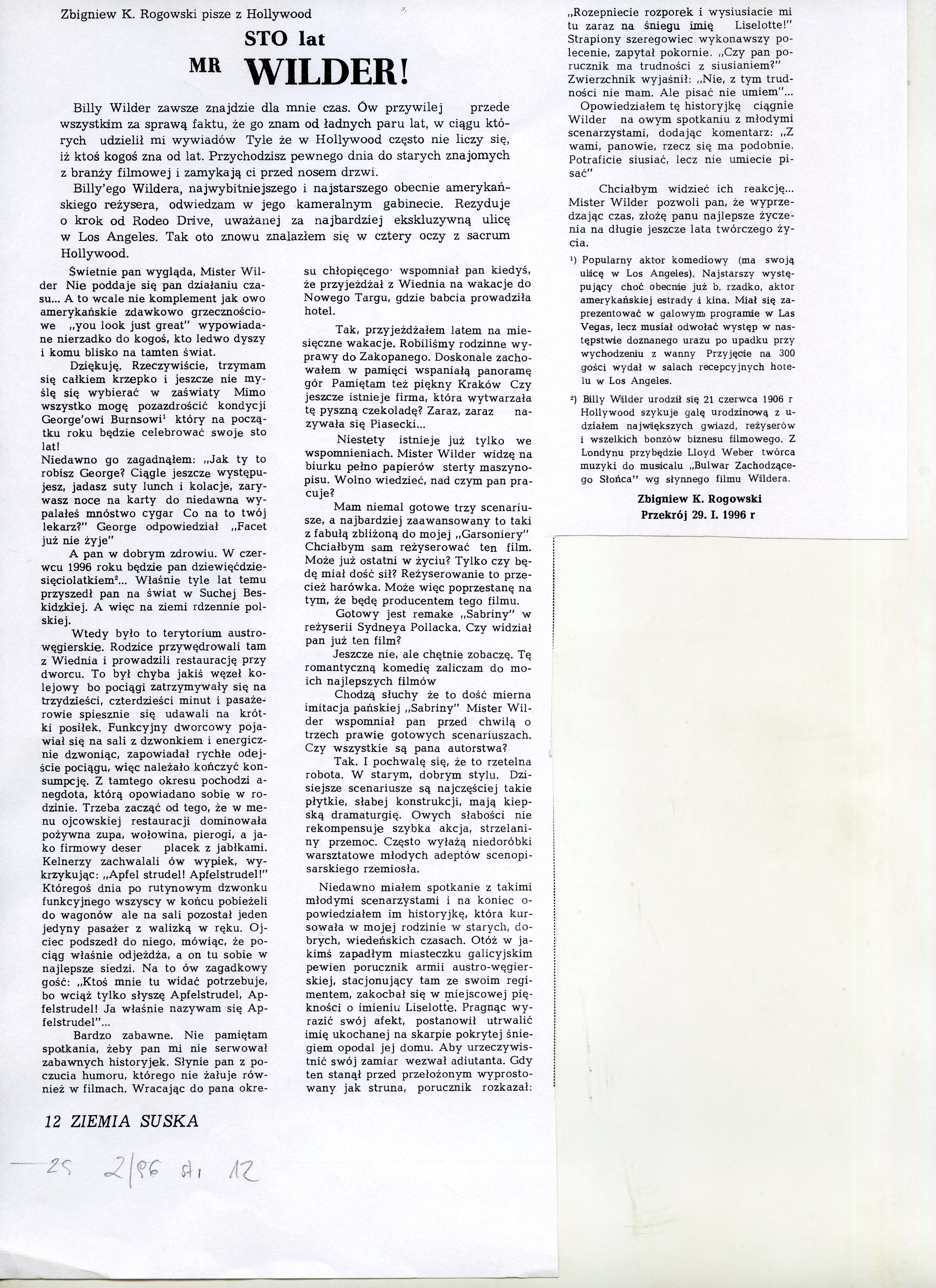 Billy Wilder do Suchej nie przyjechał.Już wtedy miał 90 lat, a miasto Sucha niewiele od niego starsze obchodziło setny jubileusz nadania praw miejskich. Odłożył przyjazd na wiosnę następnego roku, ale zdrowie nie pozwoliło mu przylecieć do miasteczka, w którym “wszystko się zaczęło. Podobno był bardzo wzruszony faktem, że w rodzinnym mieście nazwano ulicę jego imieniem i nazwiskiem. Wtedy w Suchej reprezentował go jego przyjaciel, Zbigniew Karol Rogowski, dziennikarz, publicysta, i krytyk filmowy, który całą sprawę nagłośnił i doprowadził do końca, albo początku, jak kto woli.