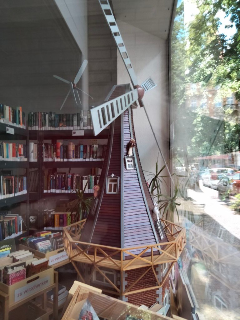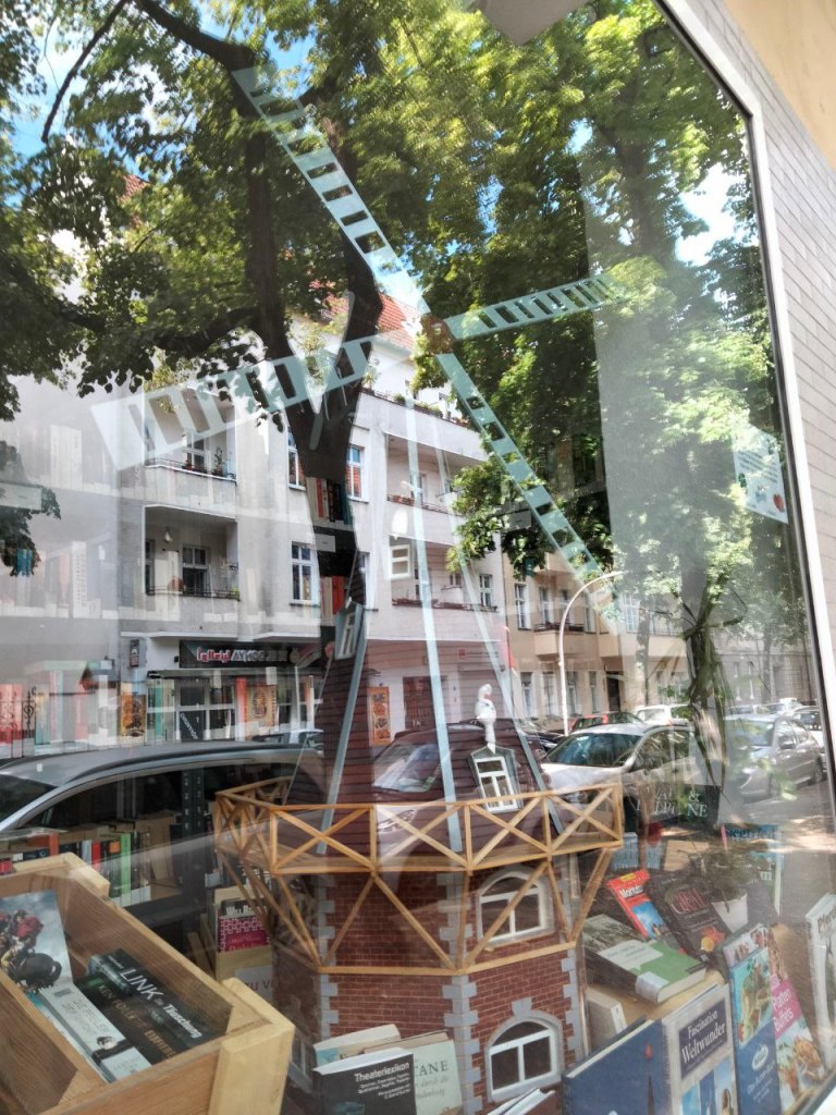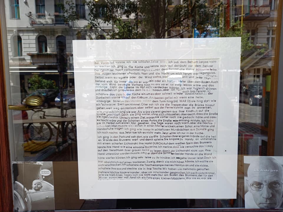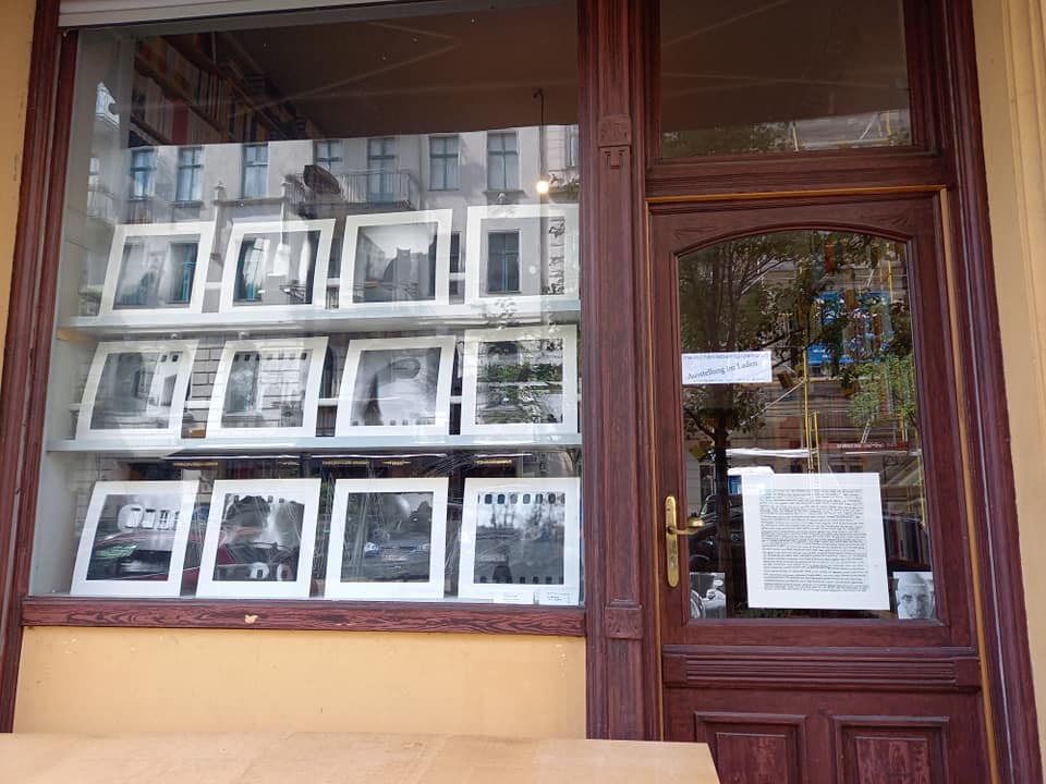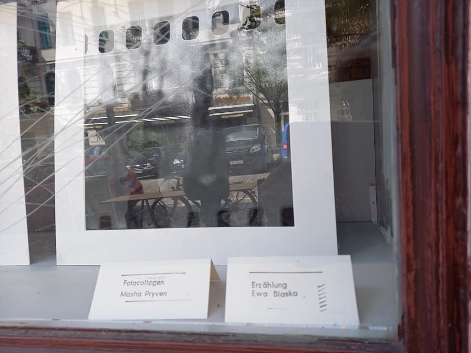 Am 19. Mai 2021 stellte Masha ihre Foto-Collagen im Fenster des Antiquariats Mutabor in der Immanuelkirchstraße in Berlin; mein Text hat sie mittels eines Kinderstempelsets per Hand gedruckt und im Türfenster plaziert.