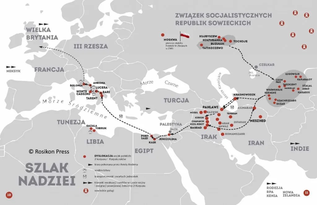 We wrześniu 1942 roku Armia Andersa została przetransportowana z Persji do Iraku w rejon Kirkut-Mosul. I jeżeli tym razem z przesunięciem wojska nie było większych problemów, to z kolei administracja brytyjska sprzeciwiła się ewakuacji ludności cywilnej, wyrażając zgodę na jej przesunięcie jedynie wtedy, gdy nie będzie wśród niej Żydów. Zmusiło to polskie władze do ominięcia zakazu poprzez zorganizowanie transportu morskiego wokół Półwyspu Arabskiego. Z kolei dzieci żydowskie, przebrane w mundurki szkoły katolickiej, odbyły podróż do Palestyny samochodami ciężarowymi. Przybycie Wojska Polskiego do Palestyny należy datować na kwiecień 1943 roku – pisze S. Strzyżewski.