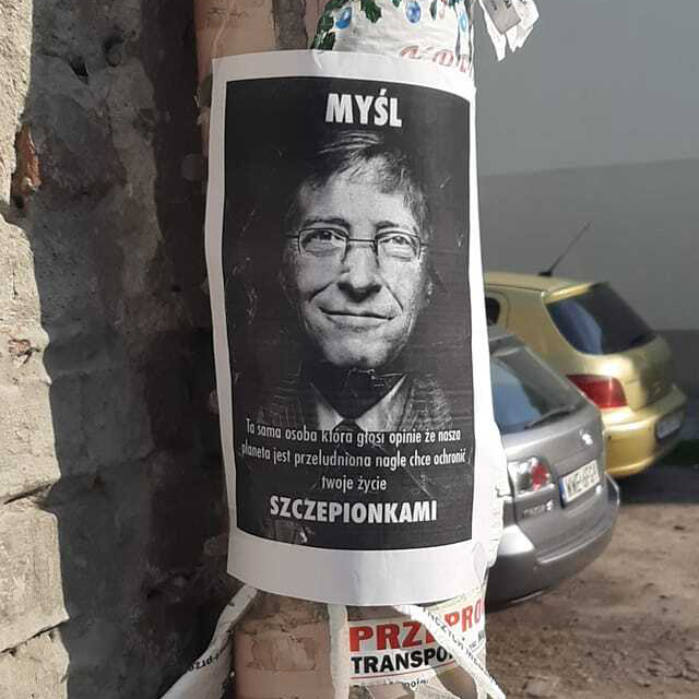 „MYŚL. Ta sama osoba, która głosi opinie, że nasza planeta jest przeludniona nagle chce chronić twoje życie SZCZEPIONKAMI”. Gates z miłego pana filantropa, który fundował komputery polskim szkołom, momentalnie wyrósł na uosobienie zła na świecie.