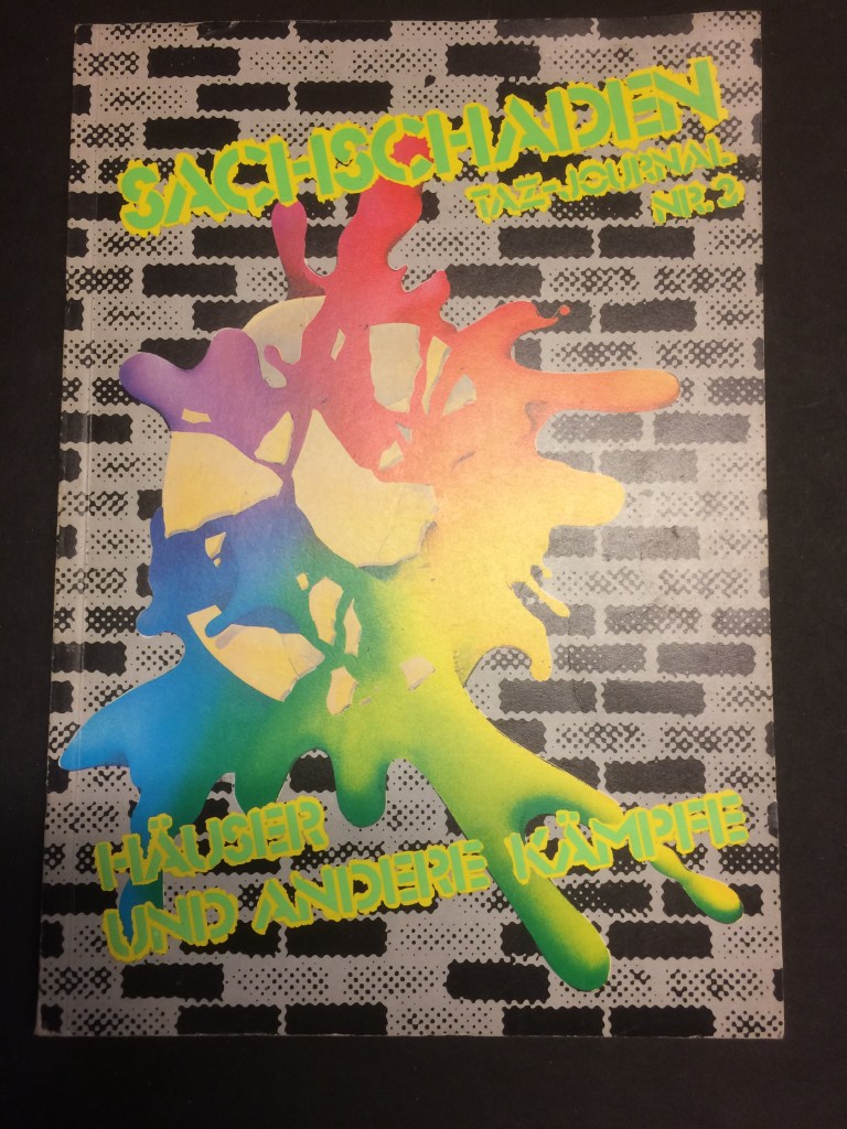Berlińska lewicowa (wówczas) gazeta TAZ, 29/30 kwietnia 1981 roku. Po lewej okładka broszury: Sachschaden, TAZ-Journal numer 3, Häuser und andere Kämpfe (Straty materialne,Domy i inne walki).Na złamanej lancy Don Quizoffa napis LÄSST DIE LEUTE FREI (zwolnijcie ludzi).