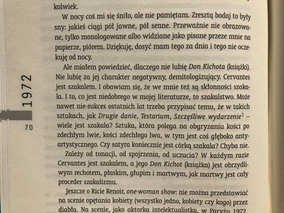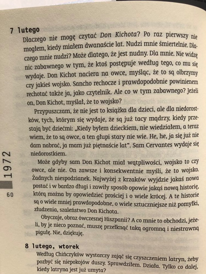 I jeszcze jeden PS, dwa wpisy w Dziennikach Mrożka, nadesłane mi przez Arkadiusza Łubę. Odkrył je badając rysunki satyryczne Sławomira Mrożka. Okazuje się, że opinia Chiquitina, iż Don Kichot jest głupkowatą książką dla chłopaczków, wcale nie jest samotną wyspą na morzu zachwytów.