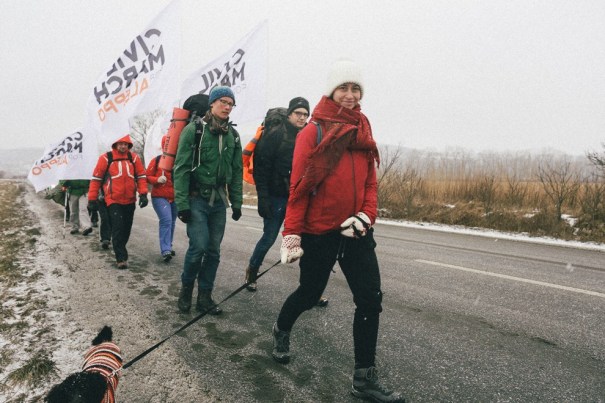Marta i Czaj, czyli Kobieta z psem a raczej “z pieską”. Kobieta i “pieska” były już na marszu co najmniej trzy razy, czasem dołącza do nich jeszcze siostra Marty, Olga. Są zawsze uśmiechnięte, pogodne, można by nawet rzec – rozbrykane.