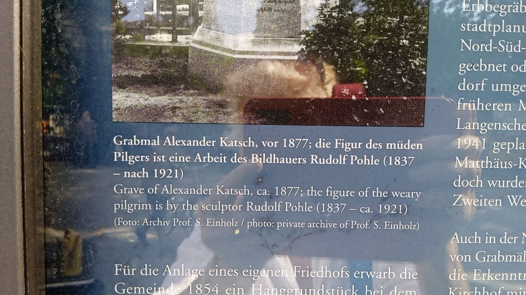 Die Figur hat Rudolf Pohlegeschaffen. Die Idee sollte aber vonHermann Katsch stammen, einen Maler. Pohle war ein bekannter Schöpfer hochemotionaler Skulpturen, Katsch ein Maler, der für seine Porträts menschlicher Typen geschätzt wurde. Pohle, schreibt man auf Wikiwand, verband die ernste Würde der äußeren Erscheinung und tiefe Empfindung besonders in seinen Grabfiguren. Die Fertigung von Grabmalplastiken war für einige Jahre sein künstlerischer Schwerpunkt. Am Anfang der 1880er Jahre erhielt er den Auftrag, für Eberswalde ein Denkmal des Oberlandforstmeisters von Hagen zu fertigen. Es folgte 1892 ein Marmordenkmal für Alois Senefelder, den Erfinder der Lithografie, auf dem Senefelderplatz in Berlin. Es war seinerzeit das erste Denkmal für einen Handwerker und galt als „eine der schönsten Arbeiten der modern-realistischen Schule“.