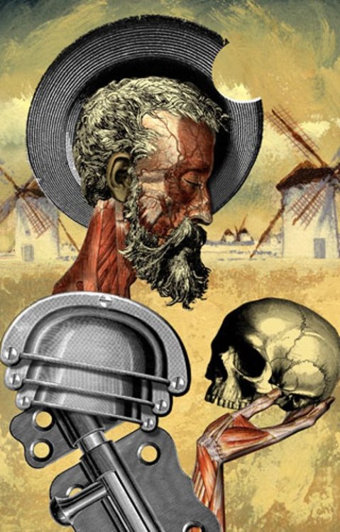 Niedawno wiadomo kto (Arkadiusz Łuba) podesłał mi świetny portret Salmana Rushdie jako Don Kichota. Gdy zajrzałam do internetu, stwierdziłam, że autor, Fernando Vicente, zresztą artysta niezwykle płodny, wielokrotnie w swej twórczości portretował Rycerza Smętnego Oblicza. Tu kilka przykładów znalezionych w sieci: